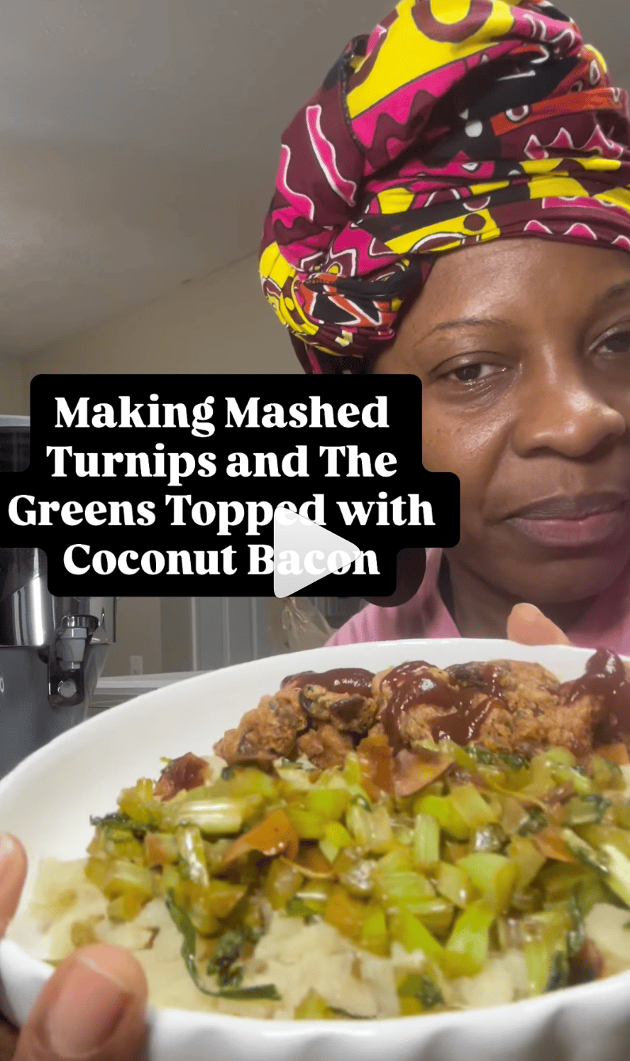 COZY RECIPE INSIDE MASHED TURNIPS AND THE GREENS TOPPED WITH COCONUT BACON I found some amazing Turnips at the FRESH MARKET at Oyun Botanical Gardens this past week and wasn't quite sure what to do with them. After chatting with someone about all of the things that you can do with turnips, I decided to make these gorgeous mashed turnips and topped them with some of its greens and coconut bacon. This dish was inspired by the resident horticulture therapist at Oyun and Ras Kofi, The Farmer....