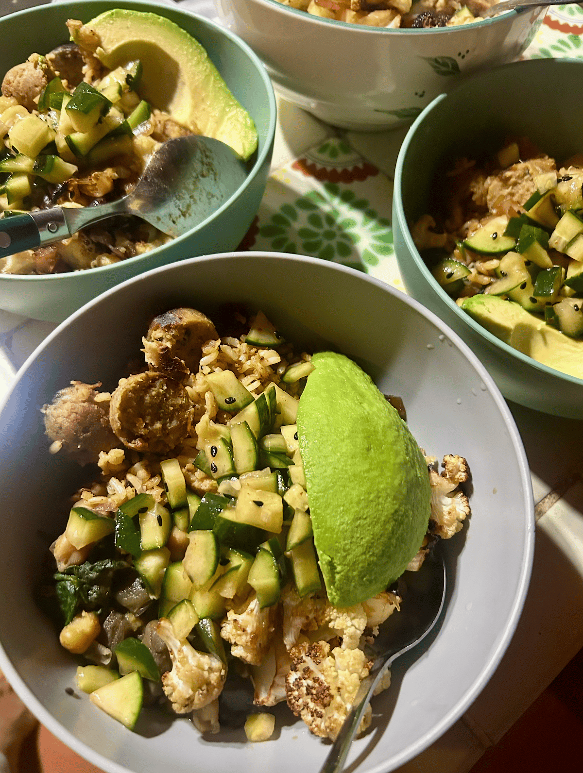 Round Two Recipe: Leftover Rice & Roasted Cauliflower Bowl with Vegan Sausage & Cucumber Salad One of my favorite ways to get the most out of meal prep is to reinvent leftovers into a fresh, delicious second-round dish. This week, I transformed some roasted cauliflower, cucumber salad (tossed with black sesame seeds and a pinch of salt), vegan sausage, and leftover rice into a satisfying bowl for the family — topped with a slice of creamy avocado for an added boost of flavor and nutrition. Here’s how you can make this easy, wholesome bowl too! Ingredients: